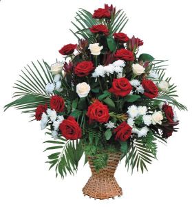 Ритуальный венок — плетёная корзинка из искусственных материалов, украшенная лентами и символами памяти. Предназначен для церемоний и кладбища; обычно компонуется с цветами и мини-элементами, подчеркивающими память и уважение.