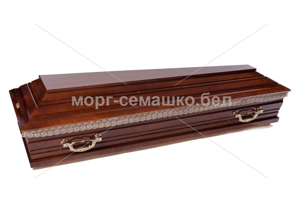 Прямой лакированный гроб является одним из стандартных вариантов погребальной мебели. Форма — прямоугольная без излишних изгибов; корпус обычно комплектуется крышкой и днищем. Внешняя поверхность облицована лаком, который придает глянцевый вид и обеспечивает защиту древесины. Основные материалы: массив древесины (бук, дуб, ясень, кедр, сосна) или клеёная фанера; внутренняя обивка выполняется тканью или бархатом. Ручки для переноски обычно располагаются по бокам и могут быть металлическими или декоративно отделанными. Размеры и конфигурация зависят от роста покойного и традиций обряда.