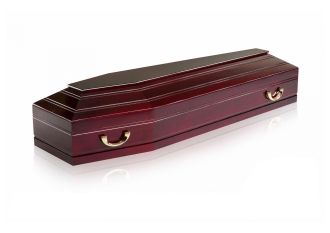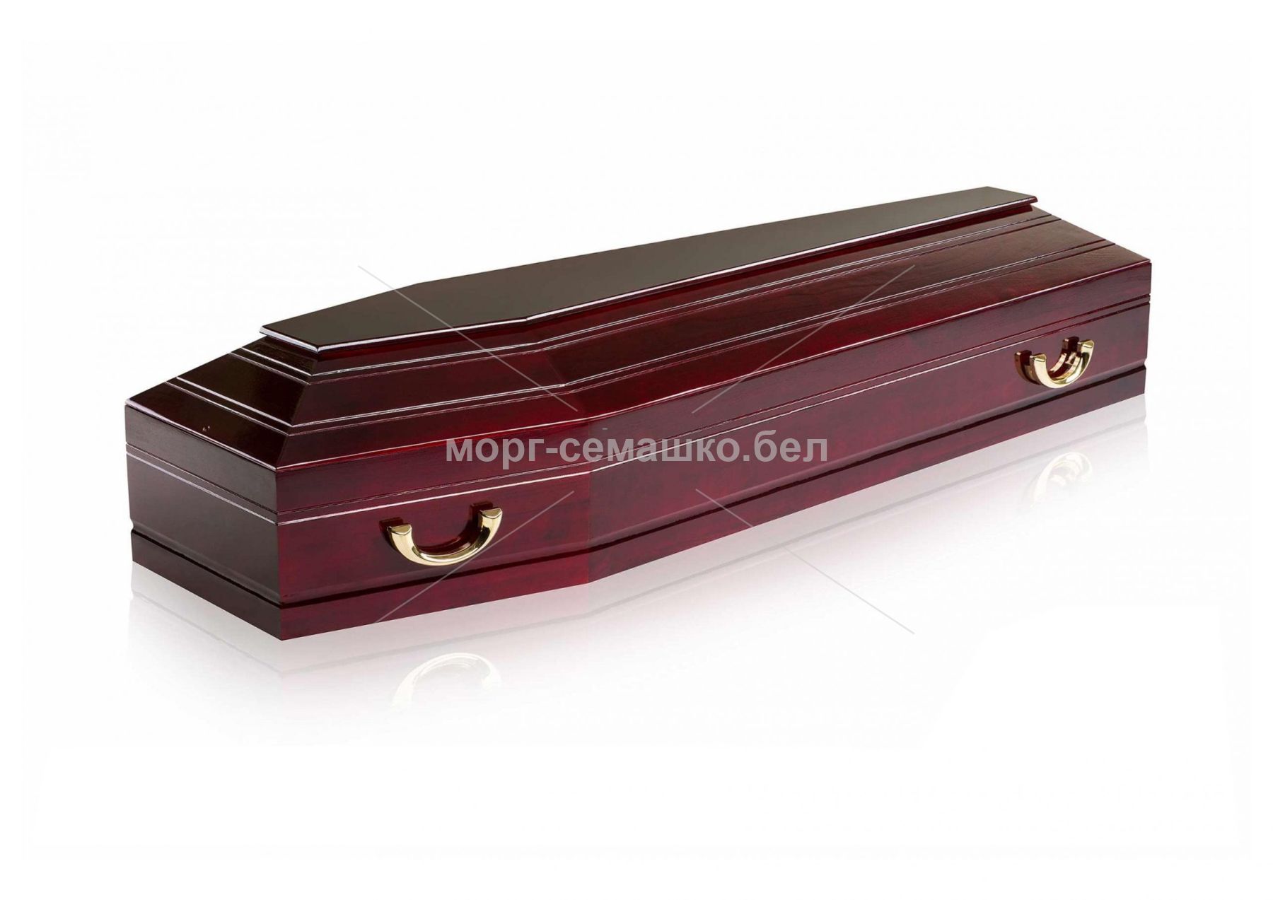 Прямой лакированный гроб является одним из стандартных вариантов погребальной мебели. Форма — прямоугольная без излишних изгибов; корпус обычно комплектуется крышкой и днищем. Внешняя поверхность облицована лаком, который придает глянцевый вид и обеспечивает защиту древесины. Основные материалы: массив древесины (бук, дуб, ясень, кедр, сосна) или клеёная фанера; внутренняя обивка выполняется тканью или бархатом. Ручки для переноски обычно располагаются по бокам и могут быть металлическими или декоративно отделанными. Размеры и конфигурация зависят от роста покойного и традиций обряда.