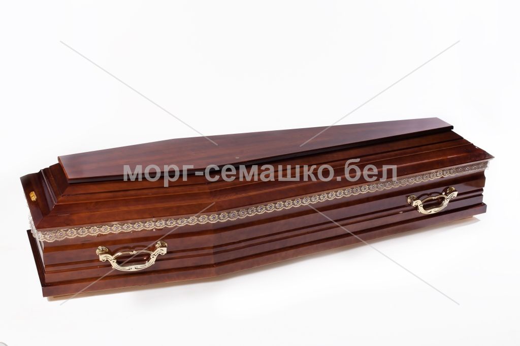 Шестигранный лакированный гроб является одним из стандартных вариантов погребальной мебели. Форма — шестигранная без излишних изгибов; корпус обычно комплектуется крышкой и днищем. Внешняя поверхность облицована лаком, который придает глянцевый вид и обеспечивает защиту древесины. Основные материалы: массив древесины (бук, дуб, ясень, кедр, сосна) или клеёная фанера; внутренняя обивка выполняется тканью или бархатом. Ручки для переноски обычно располагаются по бокам и могут быть металлическими или декоративно отделанными. Размеры и конфигурация зависят от роста покойного и традиций обряда.