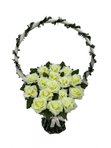Ритуальный венок — плетёная корзинка из искусственных материалов, украшенная лентами и символами памяти. Предназначен для церемоний и кладбища; обычно компонуется с цветами и мини-элементами, подчеркивающими память и уважение.