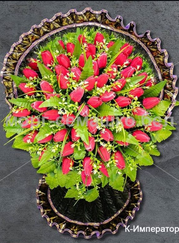 Ритуальный венок — плетёная корзинка из искусственных материалов, украшенная лентами и символами памяти. Предназначен для церемоний и кладбища; обычно компонуется с цветами и мини-элементами, подчеркивающими память и уважение.