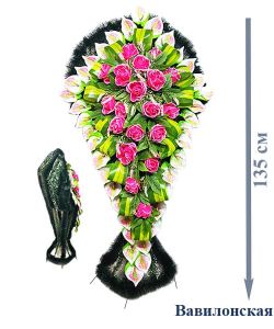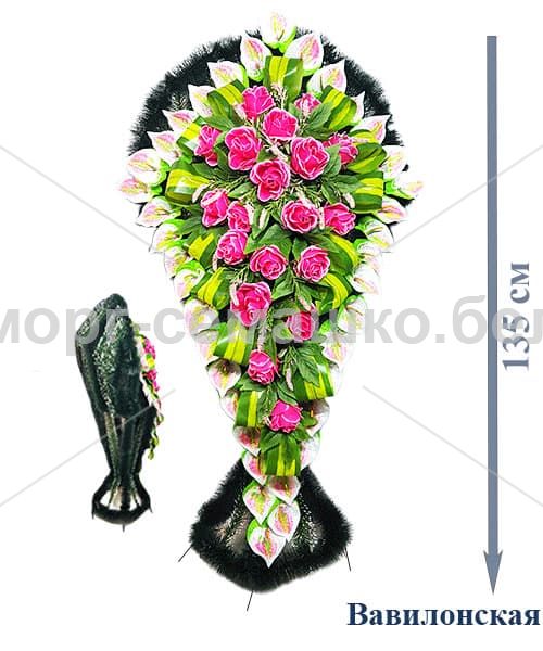 Ритуальный венок — плетёная корзинка из искусственных материалов, украшенная лентами и символами памяти. Предназначен для церемоний и кладбища; обычно компонуется с цветами и мини-элементами, подчеркивающими память и уважение.