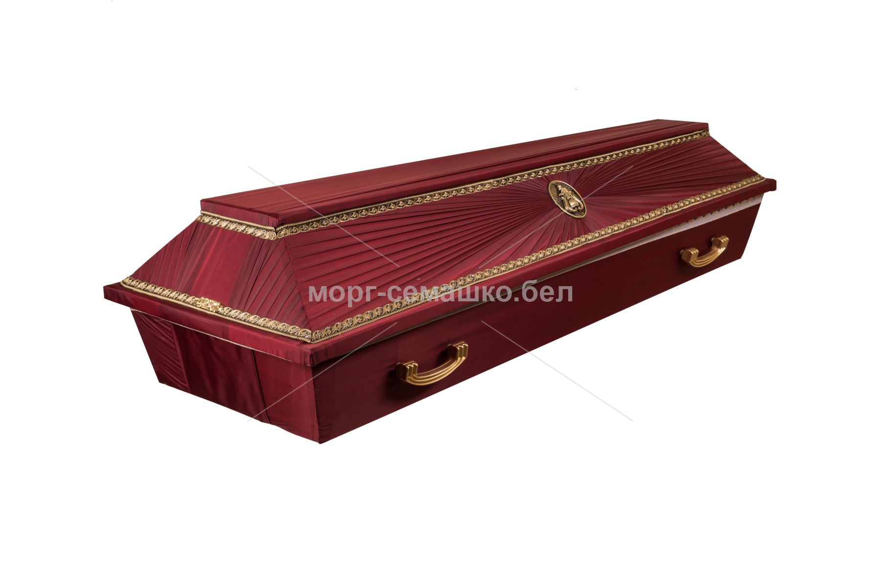 Номер 13 бордовый; 4-х гранный прямой; гроб из досок, обтянутый тканью, является одним из стандартных вариантов погребальной мебели. Форма прямоугольная без излишних изгибов; корпус обычно комплектуется крышкой и днищем. Внешняя поверхность облицована тканью, что придаёт аккуратный вид и смягчает общий образ погребения. Основные материалы — массив древесины (сосна) или клеёная фанера; ручки для переноски располагаются по бокам и могут быть металлическими или декоративно отделанными. Размеры и конфигурация зависят от роста покойного и традиций обряда.